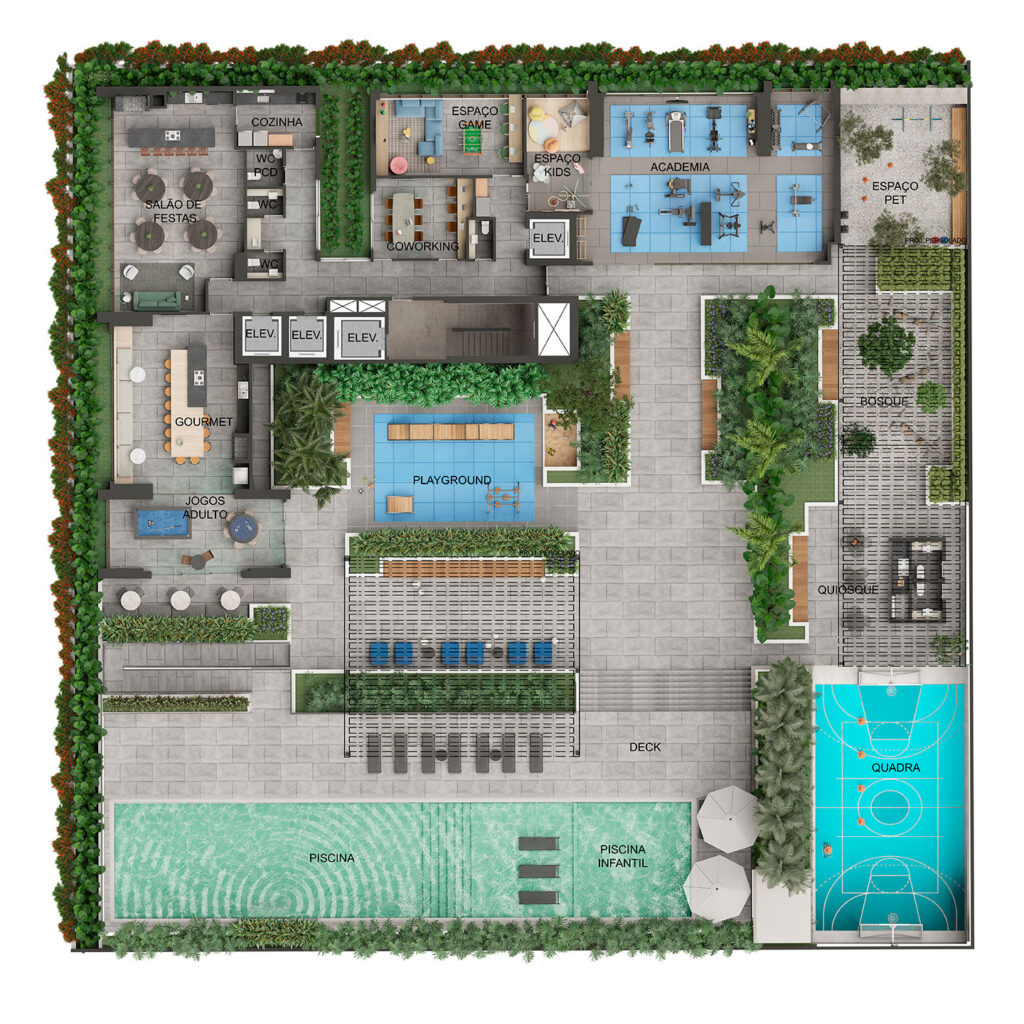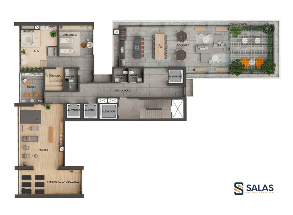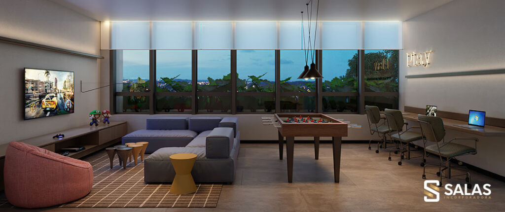 Salão de festas, espaço produtividade, espaço teen e gamer, espaço kids, fitness center, espaço, Gourmet Vip Salas, Gourmet Vip Salas, Sports Lounge Salas, Playground, Pergolado.